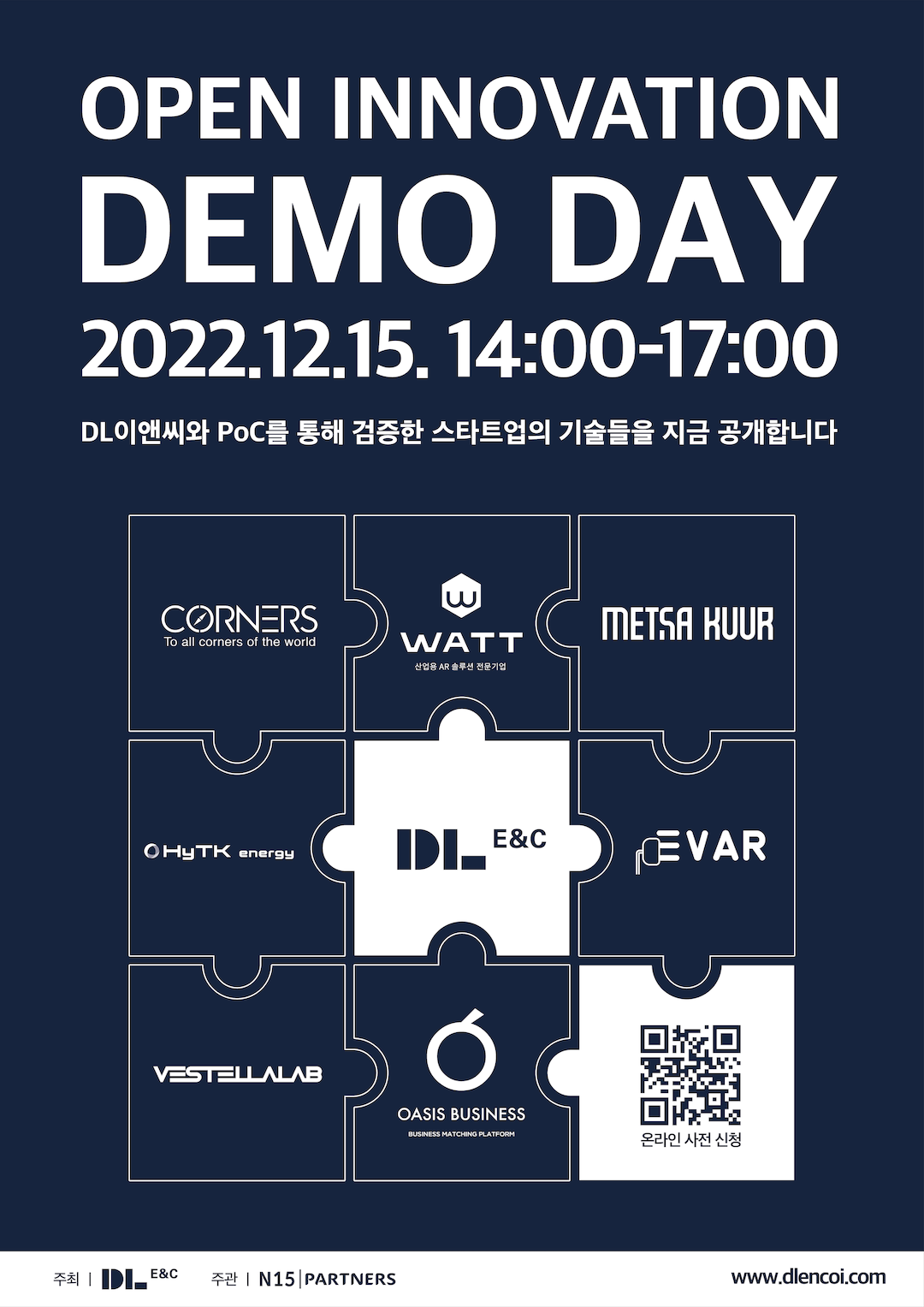 On December 15, “DL E&C Open Innovation Demo Day” was held at the lounge in the working space of N15 PARTNERS. The event was planned to share the accomplishment of the DL E&C open innovation program and provide startups with opportunities for investment attraction by inviting external VCs to the site. In addition to this year’s program, N15 PARTNERS had associated collaboration between five promising startups and DL E&C in 2021. Besides the program related to the construction field, N15 PARTNERS is establishing open innovation platforms in various other areas. Keen attention and support are expected.